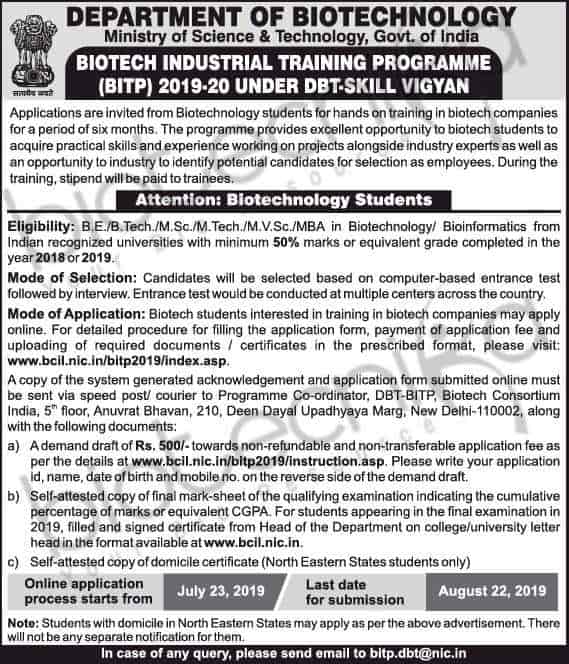Mode of Application: Biotech students Interested in training In biotech companies may apply online. For detailed procedure for filling the application form, payment of application fee and uploading of required documents/certificates in the prescribed format, please visit: http://www.bcil.nic.in/bitp2019/instruction.asp