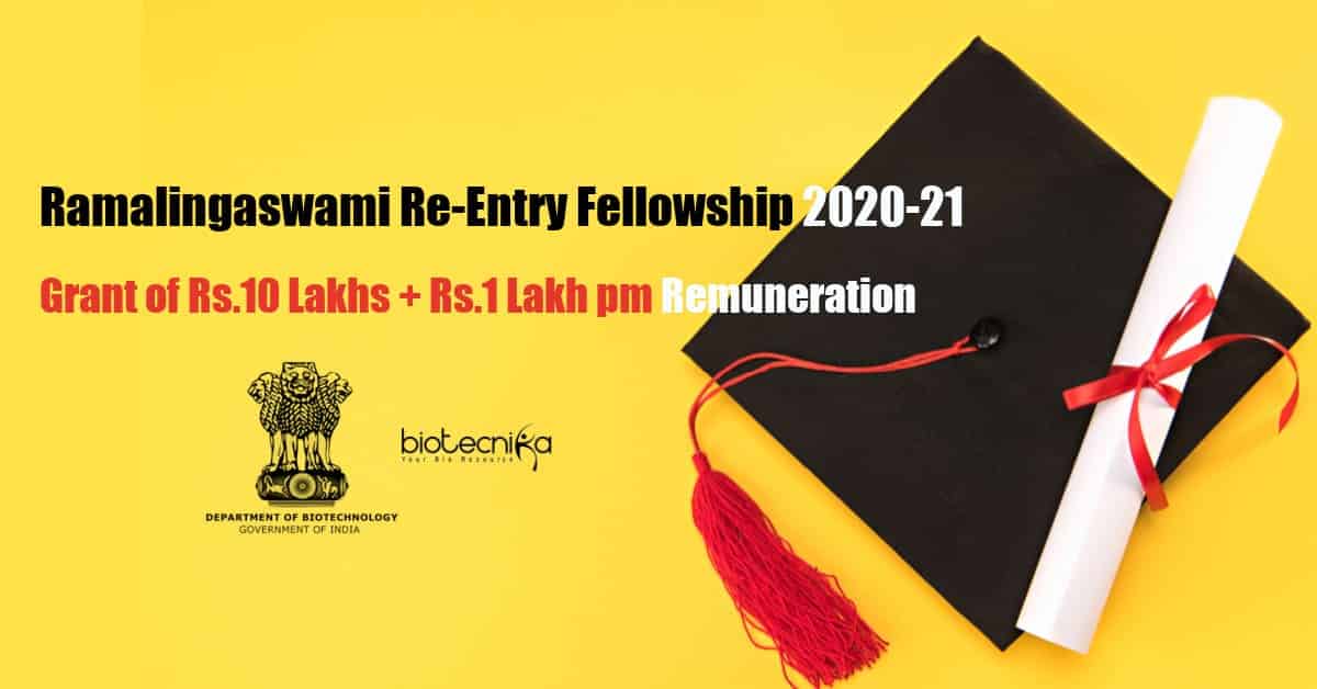 Ramalingaswami Re-Entry Fellowship 2020-21 | Grant of Rs.10 Lakhs + Rs.1 Lakh pm Remuneration. Ramalingaswami Re-Entry Fellowship 2020-21 – Applications Invited. Indian Nationals who are abroad are encouraged to check out this golden opportunity and all of its details below: