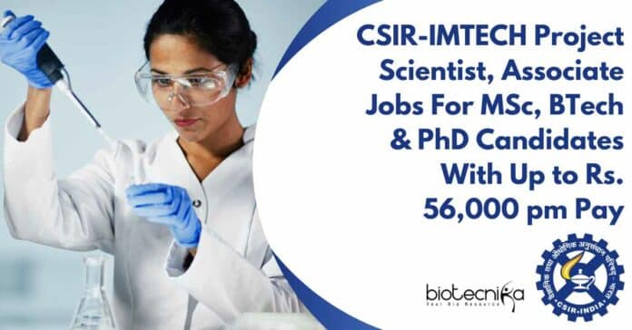 IMTECH Project Scientist & Associate Jobs For MSc, BTech & PhD Candidates With Up to Rs. 56,000 pm Pay. MSc, PhD & MTech Biotech and Life Sciences. Project Scientist & Associate Recruitment. Interested and eligible applicants can check out all of the details on the same below –