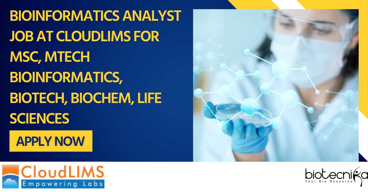 Bioinformatics Analyst Job at CloudLIMS For MSc, MTech Bioinformatics, Biotech, Biochem, Life Sciences. CloudLIMS Bioinformatics Analyst job opening. Interested and eligible applicants can check out all of the details on the same below