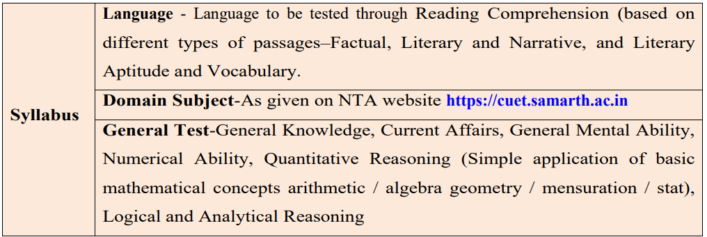 The syllabus for domain specific subjects will be available on NTA website https://cuet.samarth.ac.in.