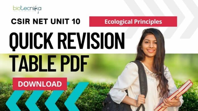 CSIR NET Unit 10, Ecological Principles, covers a broad range of topics related to the study of ecology and the principles that govern the interactions between living organisms and their environment. To help students quickly review and revise these topics, a Quick Revision Table in PDF format can be a valuable resource.