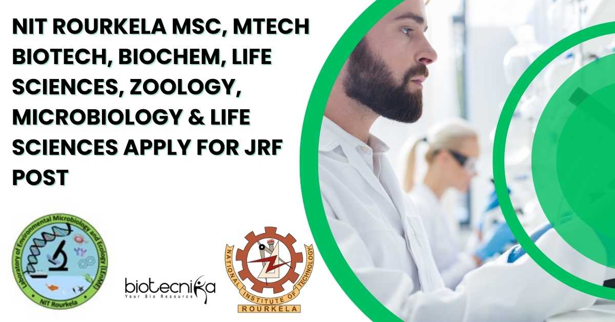 NIT Rourkela MSc, MTech Biotech, Biochem, Life Sciences, Zoology, Microbiology & Life Sciences Apply For JRF Post. M.Sc./M.Tech in Life Science / Microbiology / Biochemistry / Zoology/ Biotechnology / Botany / Environmental Science/ Marine Biology/ Marine Science candidates apply for a junior research fellow vacancy. Interested and eligible applicants can check out all of the details on the same below