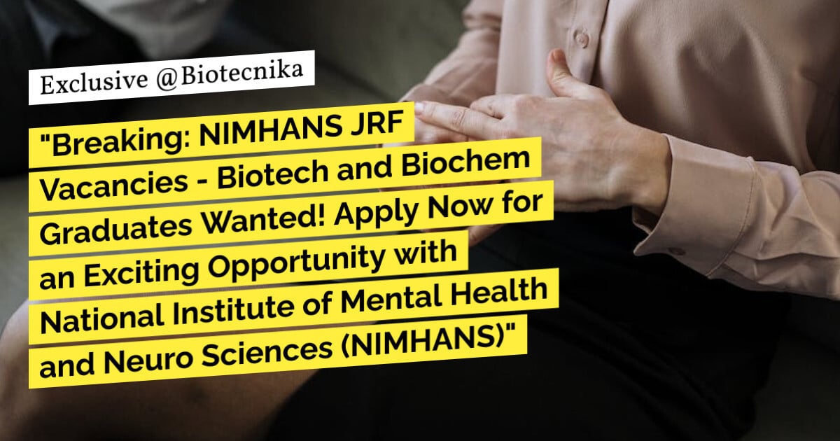 Keywords: NIMHANS JRF vacancies, Biotech, Biochem, National Institute of Mental Health and Neuro Sciences, Bengaluru. NIMHANS JRF Vacancies Available – Biotech, Biochem Apply. Please ensure you are subscribed to the Biotecnika Times Newsletter and our YouTube channel to be notified of the latest industry news. Follow us on social media like Twitter, Telegram, Facebook