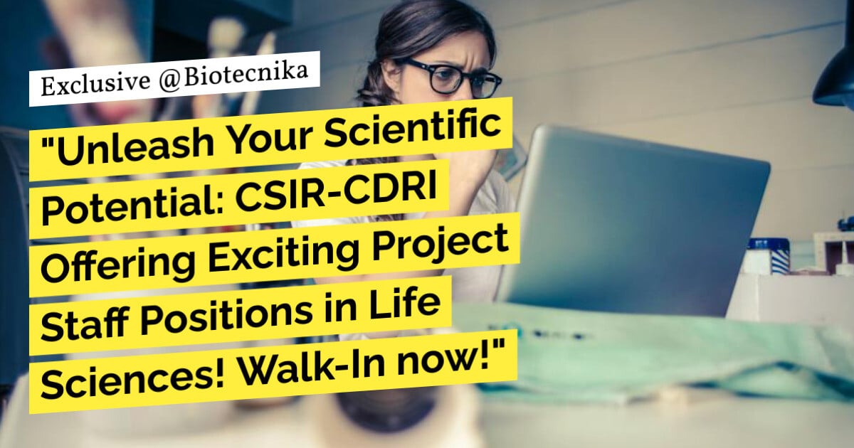 Keywords: CSIR-CDRI Project Staff Recruitment – Life Sciences Attend Walk-In. CSIR-CDRI, Project Staff Recruitment, Life Sciences, Walk-In, Job Opportunity, Research, Temporary Positions, Neurobiology, Virology, Parasite Biology, Endocrinology, Human Genetics, Analytical Biochemistry, Computational Chemistry, Medicinal Process Chemistry, Statistics, IPR, HR Management, Project Associate, Walk-in Interview, Lucknow. Please ensure you are subscribed to the Biotecnika Times Newsletter and our YouTube channel to be notified of the latest industry news. Follow us on social media like Twitter, Telegram, Facebook
