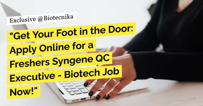 Keywords: Freshers, Syngene, QC Executive, Biotech, Job, Apply Online, Quality Control, Biologics. Freshers Syngene QC Executive – Biotech Apply Online. Please ensure you are subscribed to the Biotecnika Times Newsletter and our YouTube channel to be notified of the latest industry news. Follow us on social media like Twitter, Telegram, Facebook