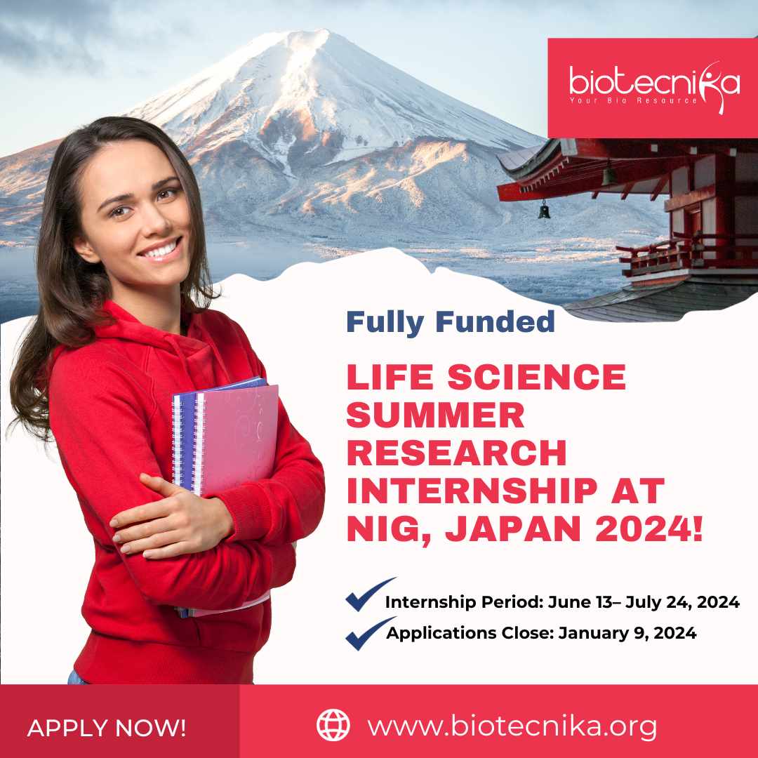 Keywords: fully funded internship, research internship, life science, genetics, NIG, summer internship, Japan 2024. Fully Funded Life Science Summer Research Internship at NIG, JAPAN 2024. Please ensure you are subscribed to the Biotecnika Times Newsletter and our YouTube channel to be notified of the latest industry news. Follow us on social media like Twitter, Telegram, Facebook