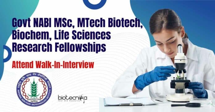 Govt NABI Research Fellowships For MSc, MTech Biotech, Biochem, Life Sciences – Attend Walk-In-Interview