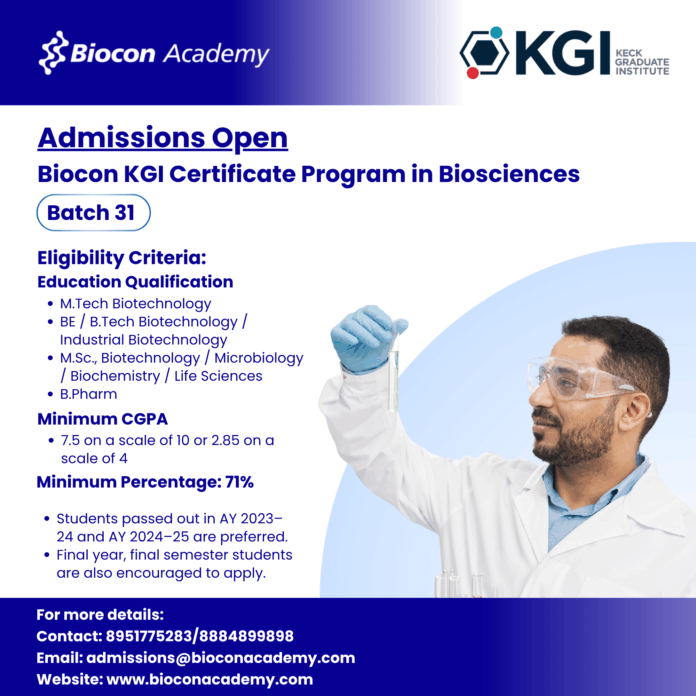 Editor’s Note: Biocon Batch 31 KGI Certificate Program in Biosciences Admissions Open. Please ensure you are subscribed to the Biotecnika Times Newsletter and our YouTube channel to be notified of the latest industry news. Follow us on social media like Twitter, Telegram, Facebook
