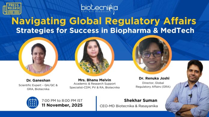 The Biopharma and MedTech industries have been undergoing a paradigm shift, driven by technological innovations, evolving global regulations, and an increasing demand for compliance-oriented professionals. To empower life science graduates and professionals to meet these challenges, Biotecnika successfully conducted a high-impact webinar titled “Navigating Global Regulatory Affairs: Strategies for Success in Biopharma & MedTech” on November 11, 2025, from 7:00 PM to 8:00 PM IST.