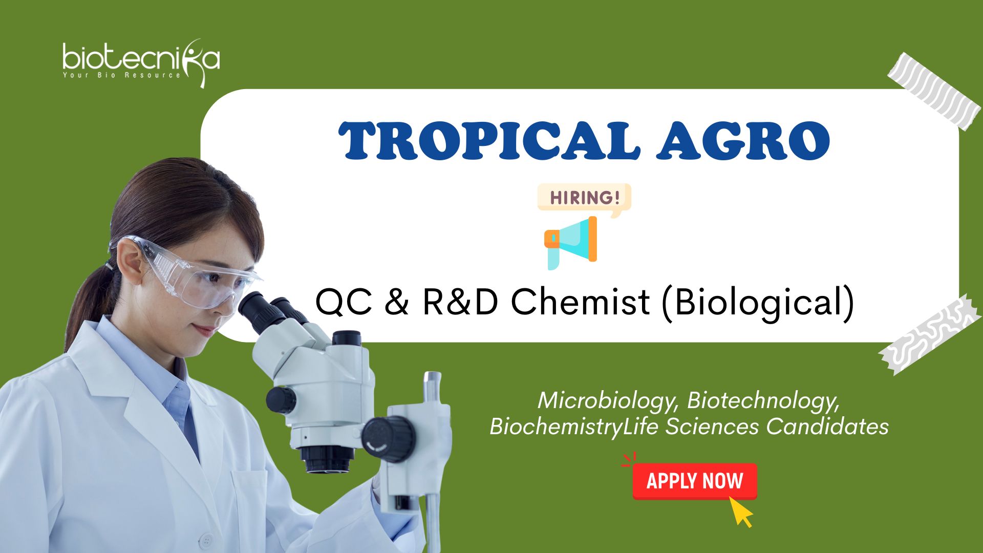 Are you ready to blend scientific innovation with stringent quality assurance? Tropical Agro is seeking a dedicated QC & R&D Chemist (Biological) to join our team in Sikandrabad, Uttar Pradesh. This dual role offers a high-impact position central to research and development jobs in the biological and agrochemical sectors. If you possess expertise in microbial cultures and analytical testing, this is an excellent quality control job and biotechnology jobs opportunity for your career growth.