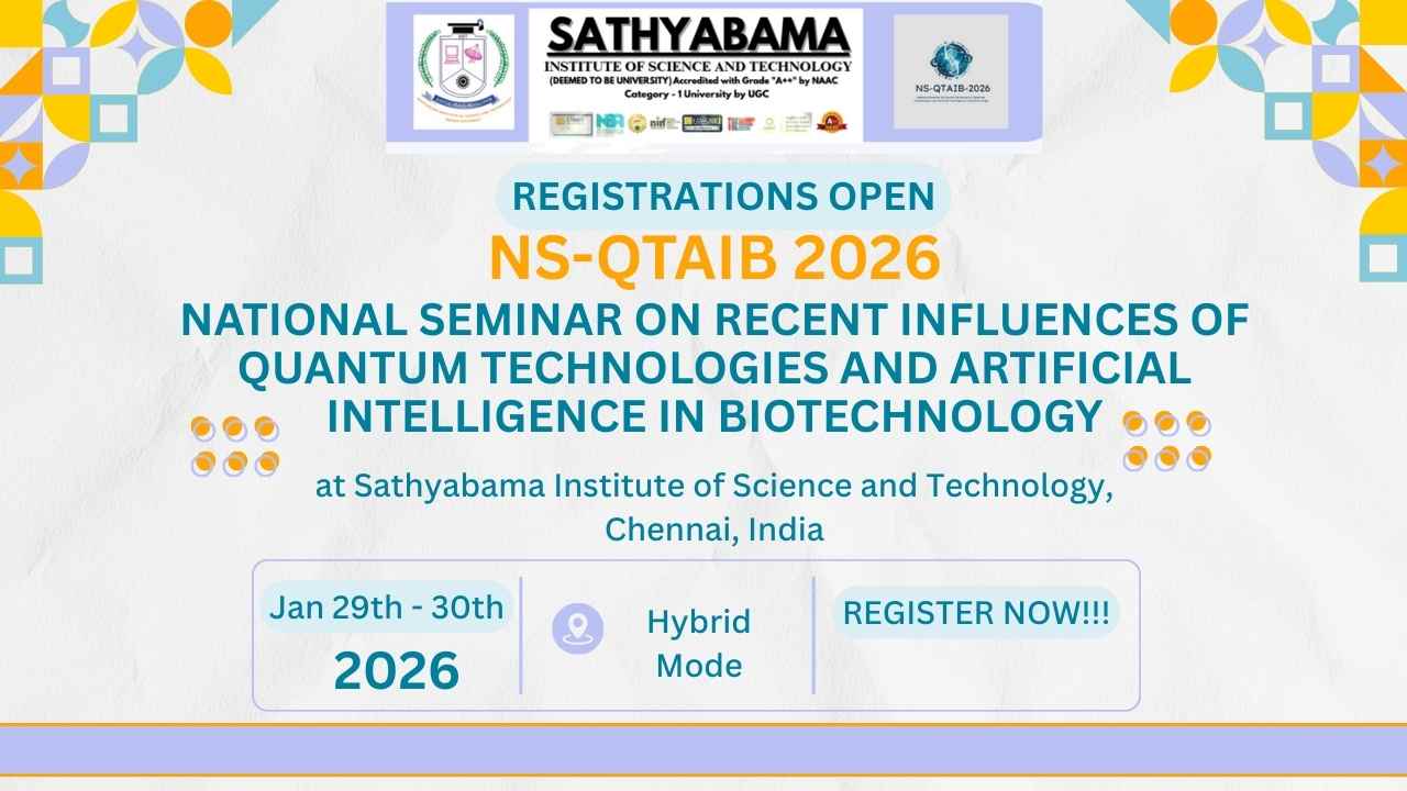 The National Seminar On Recent Influences of Quantum Technologies and Artificial Intelligence in Biotechnology (NS-QTAIB 2026) at serves as a premier platform to explore the latest breakthroughs, sustainable practices, and transformative impacts of Artificial Intelligence (AI) and Quantum Technologies in Biotechnology. This forum aims to bridge interdisciplinary innovations from the molecular to the macro level by fostering collaboration among scientists, academicians, researchers, and professionals across the nation. The conference will provide valuable insights into integrating intelligent and quantum-based systems for developing next-generation biotechnological applications, ensuring progress toward a smarter, more sustainable future for humanity.