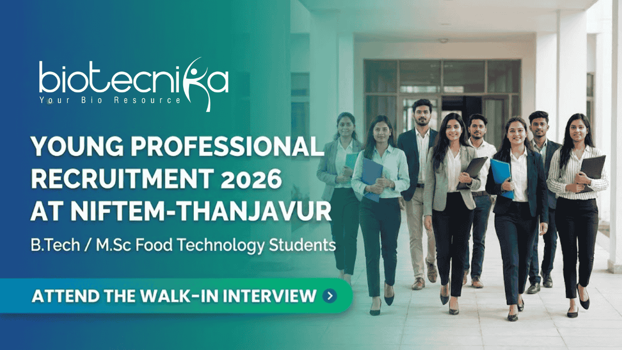 A Walk-in-interview will be conducted for the selection of Young Professional-I (YP-I) on a contract basis at National Institute of Food Technology, Entrepreneurship and Management, Thanjavur (NIFTEM-T) – 613005 (Tamil Nadu) on 27/02/2026 at 9.30 AM. Eligible and interested candidates can appear for the walk-in-interview for working in the following Projects as detailed below: